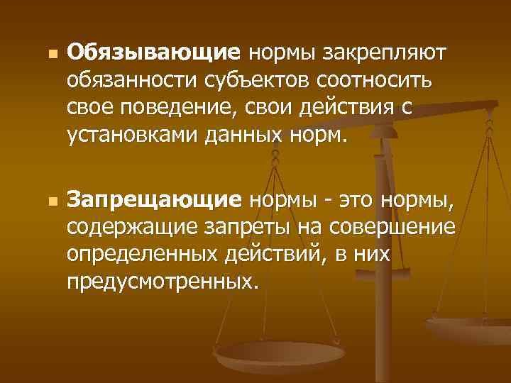 n n Обязывающие нормы закрепляют обязанности субъектов соотносить свое поведение, свои действия с установками данных норм. Запрещающие нормы - это нормы, содержащие запреты на совершение определенных действий, в них предусмотренных.