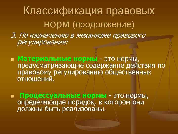 Классификация правовых норм (продолжение) 3. По назначению в механизме правового регулирования: n n Материальные нормы - это нормы, предусматривающие содержание действия по правовому регулированию общественных отношений. Процессуальные нормы - это нормы, определяющие порядок, в котором они должны быть реализованы.
