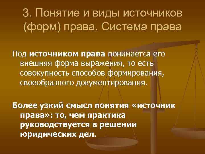 3. Понятие и виды источников (форм) права. Система права Под источником права понимается его внешняя форма выражения, то есть совокупность способов формирования, своеобразного документирования. Более узкий смысл понятия «источник права» : то, чем практика руководствуется в решении юридических дел.