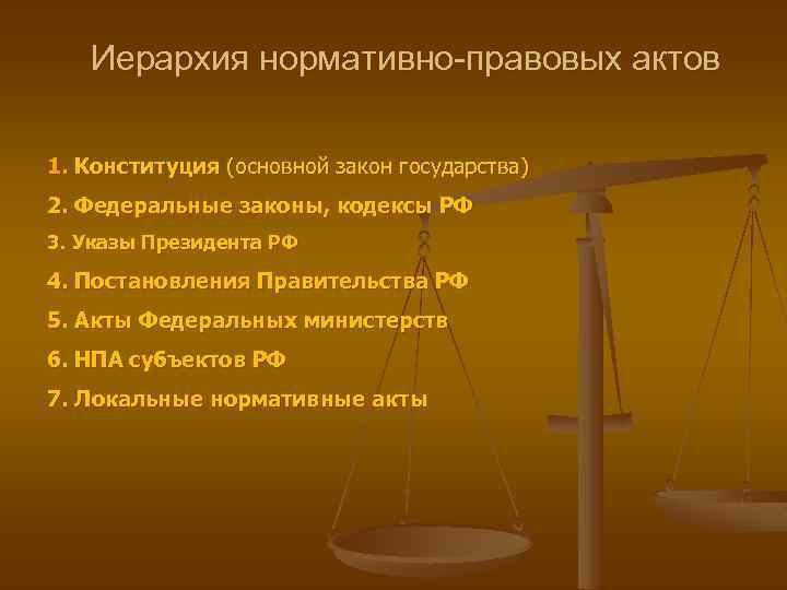 Иерархия нормативно-правовых актов 1. Конституция (основной закон государства) 2. Федеральные законы, кодексы РФ 3. Указы Президента РФ 4. Постановления Правительства РФ 5. Акты Федеральных министерств 6. НПА субъектов РФ 7. Локальные нормативные акты