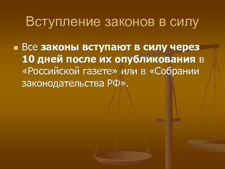 Вступление законов в силу n Все законы вступают в силу через 10 дней после их опубликования в «Российской газете» или в «Собрании законодательства РФ» .