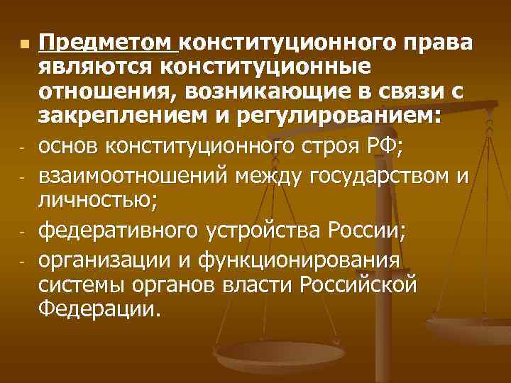 n - Предметом конституционного права являются конституционные отношения, возникающие в связи с закреплением и регулированием: основ конституционного строя РФ; взаимоотношений между государством и личностью; федеративного устройства России; организации и функционирования системы органов власти Российской Федерации.
