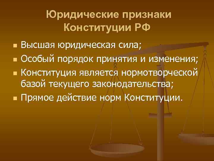 Юридические признаки Конституции РФ n n Высшая юридическая сила; Особый порядок принятия и изменения; Конституция является нормотворческой базой текущего законодательства; Прямое действие норм Конституции.