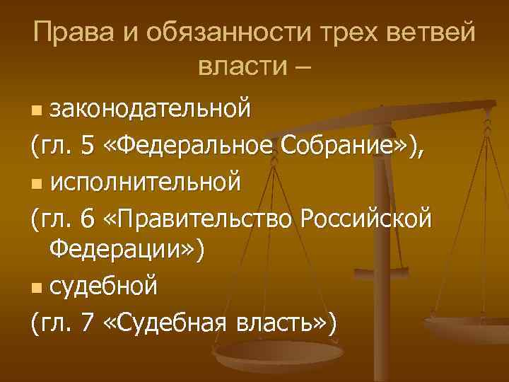 Права и обязанности трех ветвей власти – законодательной (гл. 5 «Федеральное Собрание» ), n исполнительной (гл. 6 «Правительство Российской Федерации» ) n судебной (гл. 7 «Судебная власть» ) n