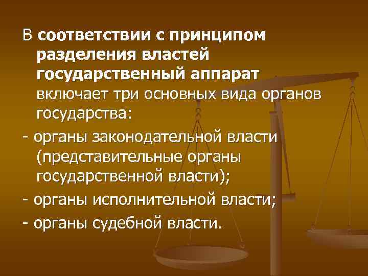 В соответствии с принципом разделения властей государственный аппарат включает три основных вида органов государства: - органы законодательной власти (представительные органы государственной власти); - органы исполнительной власти; - органы судебной власти.