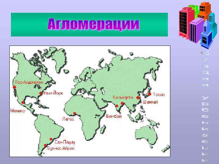 Крупнейшие агломерации(2002) 1. Токио (31 млн. чел. ) 2. Мехико (21 млн. чел. ) 3. Сеул (19, 8 млн. чел. ) 4. Сан-Паулу (18, 5 млн. чел. ) 5. Нью-Йорк (18 млн. чел) 6. Мумбаи(Бомбей) (18, 3 млн. чел) 7. Дели (17 млн. чел) 8. Лос-Анджелес (16, 6 млн. чел) 9. Джакарта (16, 5 млн. чел) 10. Каир (15, 5 млн. чел)