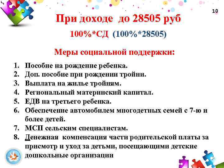 При доходе до 28505 руб 100%*СД (100%*28505) Меры социальной поддержки: 1. 2. 3. 4. 5. 6. Пособие на рождение ребенка. Доп. пособие при рождении тройни. Выплата на жилье тройням. Региональный материнский капитал. ЕДВ на третьего ребенка. Обеспечение автомобилем многодетных семей с 7 -ю и более детей. 7. МСП сельским специалистам. 8. Денежная компенсация части родительской платы за присмотр и уход за детьми, посещающими детские дошкольные организации 10