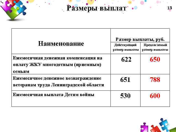 Размеры выплат Наименование 13 Размер выплаты, руб. Действующий Предлагаемый размер выплаты Ежемесячная денежная компенсация на оплату ЖКУ многодетным (приемным) семьям Ежемесячное денежное вознаграждение ветеранам труда Ленинградской области 622 650 651 788 Ежемесячная выплата Детям войны 530 600