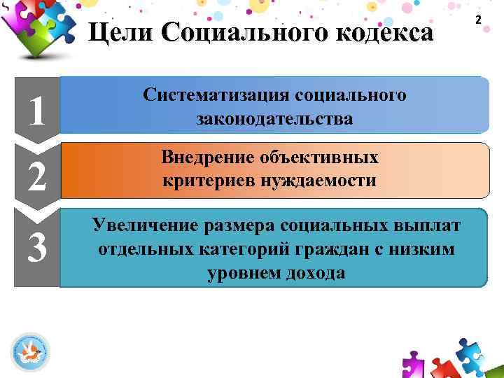 Цели Социального кодекса 1 Систематизация социального законодательства 2 Внедрение объективных критериев нуждаемости 3 Увеличение размера социальных выплат отдельных категорий граждан с низким уровнем дохода 2