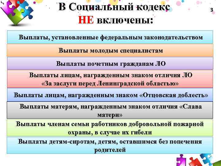 В Социальный кодекс НЕ включены: Выплаты, установленные федеральным законодательством Выплаты молодым специалистам Выплаты почетным гражданам ЛО Выплаты лицам, награжденным знаком отличия ЛО «За заслуги перед Ленинградской областью» Выплаты лицам, награжденным знаком «Отцовская доблесть» Выплаты матерям, награжденным знаком отличия «Слава матери» Выплаты членам семьи работников добровольной пожарной охраны, в случае их гибели Выплаты детям-сиротам, детям, оставшимся без попечения родителей 3