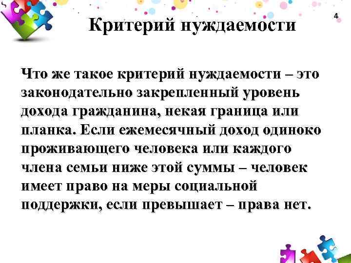 Критерий нуждаемости Что же такое критерий нуждаемости – это законодательно закрепленный уровень дохода гражданина, некая граница или планка. Если ежемесячный доход одиноко проживающего человека или каждого члена семьи ниже этой суммы – человек имеет право на меры социальной поддержки, если превышает – права нет. 4