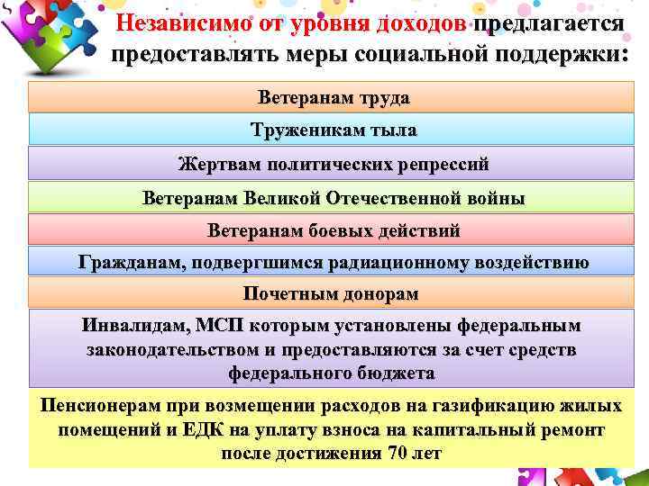 Независимо от уровня доходов предлагается предоставлять меры социальной поддержки: Ветеранам труда Труженикам тыла Жертвам политических репрессий Ветеранам Великой Отечественной войны Ветеранам боевых действий Гражданам, подвергшимся радиационному воздействию Почетным донорам Инвалидам, МСП которым установлены федеральным законодательством и предоставляются за счет средств федерального бюджета Пенсионерам при возмещении расходов на газификацию жилых помещений и ЕДК на уплату взноса на капитальный ремонт после достижения 70 лет