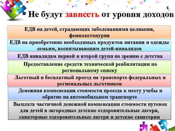 6 Не будут зависеть от уровня доходов ЕДВ на детей, страдающих заболеваниями целиакия, фенилкетонурия ЕДВ на приобретение необходимых продуктов питания и одежды семьям, воспитывающим детей-инвалидов ЕДВ инвалидам первой и второй групп по зрению с детства Предоставление средств технической реабилитации по региональному списку Льготный и бесплатный проезд на транспорте федеральных и региональных льготников Денежная компенсация стоимости проезда к месту учебы и обратно на автомобильном транспорте Выплата частичной денежной компенсации стоимости путевок для детей в загородные детские оздоровительные лагеря, санаторные оздоровительные лагеря и детские санатории