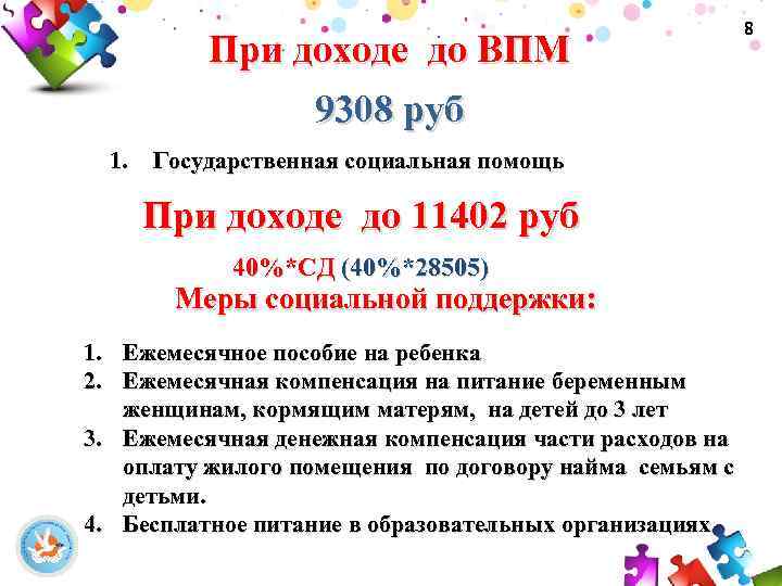 При доходе до ВПМ 9308 руб 1. Государственная социальная помощь При доходе до 11402 руб 40%*СД (40%*28505) Меры социальной поддержки: 1. Ежемесячное пособие на ребенка 2. Ежемесячная компенсация на питание беременным женщинам, кормящим матерям, на детей до 3 лет 3. Ежемесячная денежная компенсация части расходов на оплату жилого помещения по договору найма семьям с детьми. 4. Бесплатное питание в образовательных организациях 8