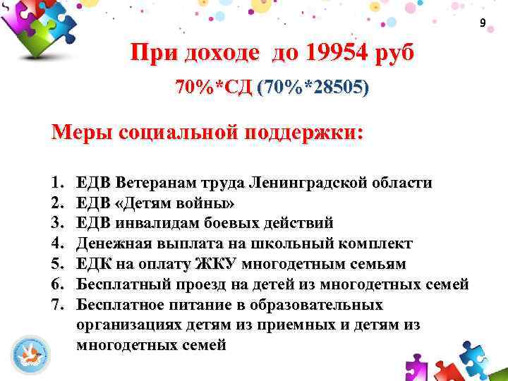 9 При доходе до 19954 руб 70%*СД (70%*28505) Меры социальной поддержки: 1. 2. 3. 4. 5. 6. 7. ЕДВ Ветеранам труда Ленинградской области ЕДВ «Детям войны» ЕДВ инвалидам боевых действий Денежная выплата на школьный комплект ЕДК на оплату ЖКУ многодетным семьям Бесплатный проезд на детей из многодетных семей Бесплатное питание в образовательных организациях детям из приемных и детям из многодетных семей