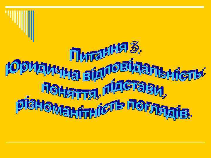 Розуміння юридичної відповідальності o Міра покарання правопорушника шляхом позбавлення його певних соціальних благ чи цінностей; o Закріплена правовими нормами необхідність певної поведінки суб'єкта права;