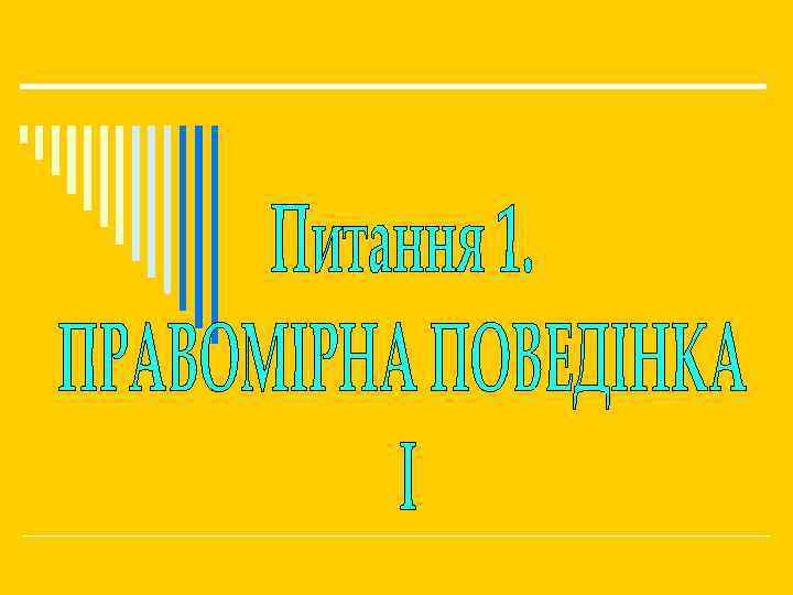 Правомірна поведінка – це суспільно необхідна бажана і допустима з точки зору інтересів громадянського суспільства поведінка індивідуальних і колективних суб’єктів, яка полягає у здійсненні норм права, гарантується і охороняється державою (діяння суб`єкта, що відповідають вимогам н-п актів). o o o Ознаки: об’єктивна можливість і необхідність; бажаність і допустимість; відповідність інтересам громадянського суспільства; гарантованість і охорона державою; відповідність поведінки нормам права спрямована на досягнення позитивних юридичних наслідків.