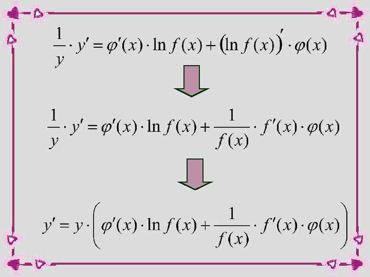 Логарифмируем обе части равенства по основанию e: Дифференцируем обе части равенства по х, учитывая, что в правой части стоит произведение:
