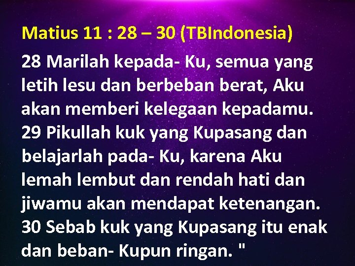 Matius 11 : 28 – 30 (TBIndonesia) 28 Marilah kepada- Ku, semua yang letih lesu dan berbeban berat, Aku akan memberi kelegaan kepadamu. 29 Pikullah kuk yang Kupasang dan belajarlah pada- Ku, karena Aku lemah lembut dan rendah hati dan jiwamu akan mendapat ketenangan. 30 Sebab kuk yang Kupasang itu enak dan beban- Kupun ringan. "