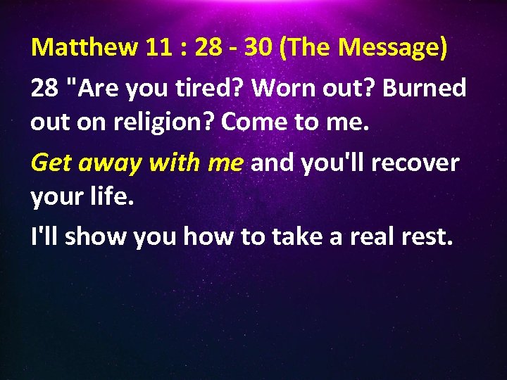 Matthew 11 : 28 - 30 (The Message) 28 "Are you tired? Worn out? Burned out on religion? Come to me. Get away with me and you'll recover your life. I'll show you how to take a real rest.