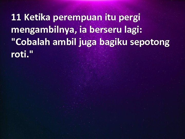 11 Ketika perempuan itu pergi mengambilnya, ia berseru lagi: "Cobalah ambil juga bagiku sepotong roti. "