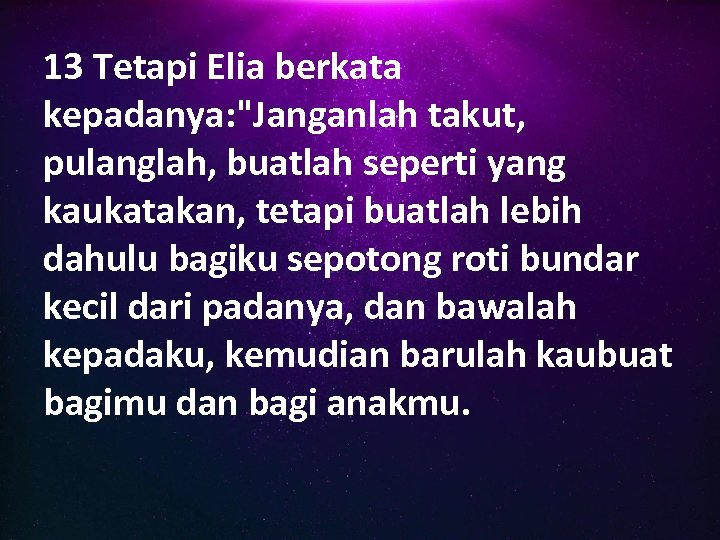 13 Tetapi Elia berkata kepadanya: "Janganlah takut, pulanglah, buatlah seperti yang kaukatakan, tetapi buatlah lebih dahulu bagiku sepotong roti bundar kecil dari padanya, dan bawalah kepadaku, kemudian barulah kaubuat bagimu dan bagi anakmu.