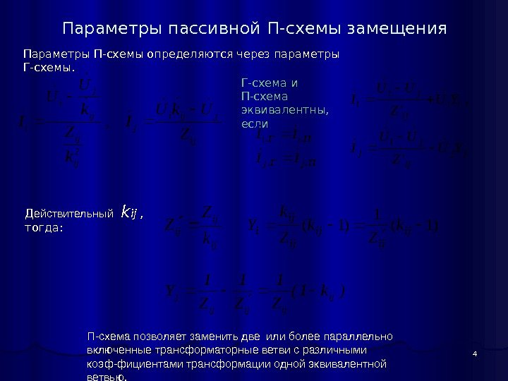3 Трансформаторы j i Ui Uj Uj Y Zij kij = Uj Ui Ii Ij j Ui Uj Yj Zij Ij i Yi Y Iii Ijj jbg. Y 3 2 ][. . 10 к. Вном. ВН к. Втхх U P g 2 ][. 100 % к. Вном. ВН АМВномхх m U SI b Ом S UP r АМВном к. Вном. ВНк. Втзк T 3 2 2. . 10 ][22 Омrzx. ТТТ ][ 100 %2 Ом S Uu z ном отвk Т 100 1. %U n. UUотв отвном. ВНотв ном. НН отв ij U U k.