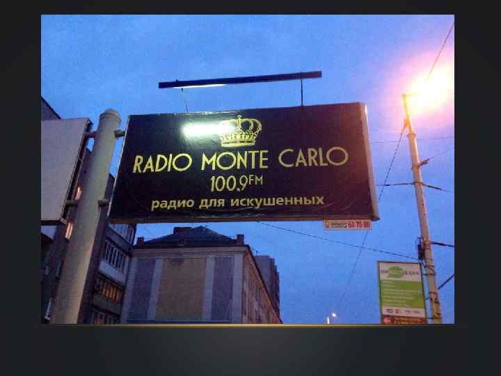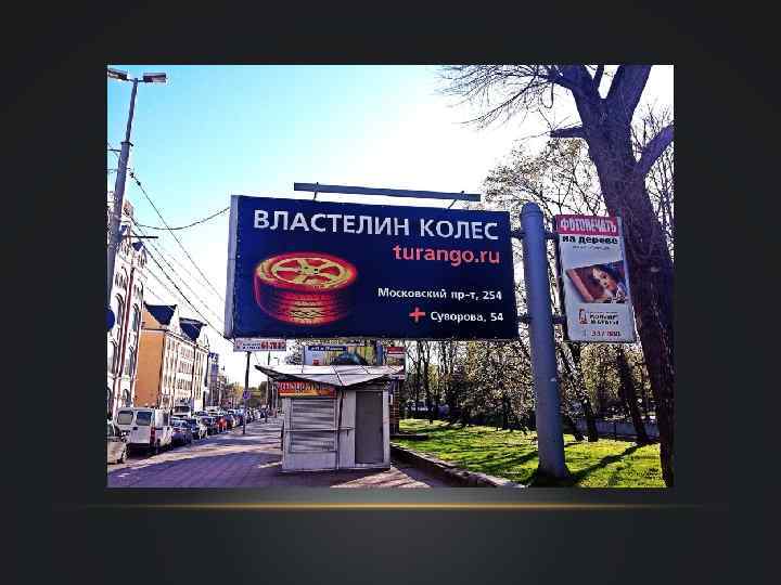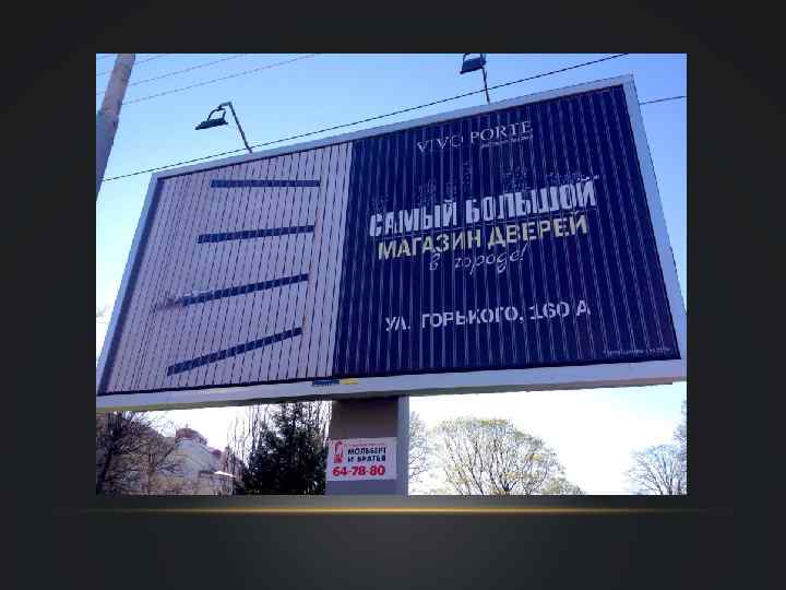 • 1. Проспект мира, сторона по направлению движения к парку, около суши-бара 5 баллов • 2. Конструкция – биллборд 10 баллов • 3. Реклама удачна с точки зрения исполнения (минимум информации, сочетаемость цветов), но не совсем выигрышна и с точки зрения расположения (смотрит по направлению движения, а не против, то есть доступна только пешеходам, а так как проспект мира достаточно широкая улица, то для водителей на другой стороне она слишком далека) 6 баллов • Общая оценка – 21 балл