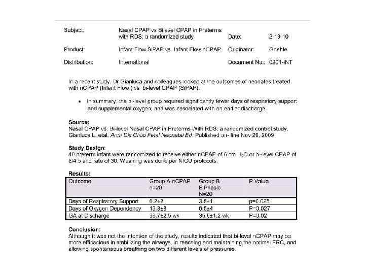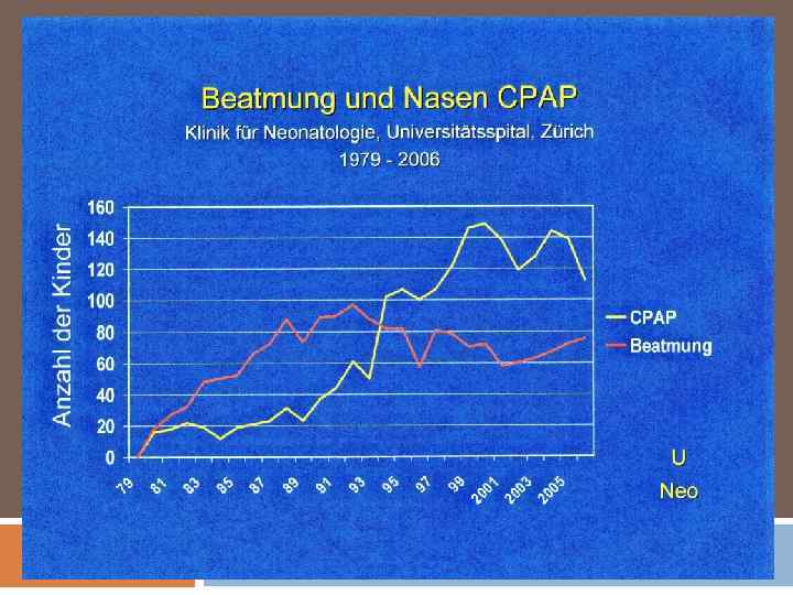 Data from a comparison of treatment of premature infants at the University of Vienna tertiary centre and the Vermont Oxford Neonatal Network as a whole (Kirchner, 2005) CPAP used Retinopathy BPD 45 -86% vs 1 -10% vs 14 -32% vs 37 -63% 8 -12% 27 -39%