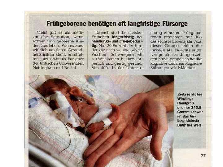 Недоношенность Пределы жизнеспособности (limit of viability) – самый ранний гестационный возрат при котором шанс выживаемости не менее 50%. В развитых странах около 50% новорожденных при гестационном возрате 24 недели выживают. При этом половина из них инвалидизированна. 80% новорожденных, при гестационном возрате 28 недель, выживают без значительных последствии.