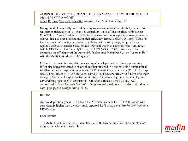 IF vs Medijet An Pediatr (Barc). 2003 Apr; 58(4): 350 -6. [Nasal continuous positive airway pressure in preterm infants: comparison of two low-resistance models]. [Article in Spanish] Gutiérrez Laso A, Sáenz González P, Izquierdo Macián I, Fernández Gilino C, Gimeno Navarro A, Gormaz Moreno M, Torres Palomares D, Morcillo Sopena F, Roqués Serradilla V. Unidad de Cuidados Intensivos. Servicio de Neonatología. Hospital Universitario La Fe. Valencia. España. aguti@teleline. es Abstract OBJECTIVE: To compare the safety and efficacy of two low expiratory resistance models of nasal continuous positive airway pressure (n-CPAP) in preterm infants. MATERIAL AND METHODS: A 1 -year prospective trial was performed in the Neonatal Intensive Care Unit of La Fe Hospital to compare the Infant Flow (IF) and Medijet (MJ) devices. All preterm infants requiring n-CPAP for respiratory distress at birth (group I), infants weighting less than 1500 g requiring postextubation (group II) and those with apneabradycardia syndrome (ABS) (group III) were included. The patients were randomly assigned to IF or MJ. RESULTS: A total of 125 patients received 226 treatments (IF: n 5 126: MJ: n 5 110). The mean gestational age was 29. 4 weeks and the mean birth weight was 1340 g. Efficacy. In group I (n 5 73) no difference were found between systems and 6 hours' after initiation of n-CPAP decreases in Fi. O 2, CO 2 and respiratory effort were similar. The need for intubation was also similar (IF: 34. 6 %; MJ: 24. 1 %). In group II (n 5 73) the need for reintubation at 48 hours was similar with both treatments (IF: 19 %; MJ: 8 %). In group III (n 5 80) resolution of ABS was similar after 24 hours of n-CPAP (IF: 46 %; MJ: 58 %). The need for intubation was also similar (IF: 26 %; MJ: 10 %). Complications. Air leaks occurred in six preterm infants (IF: 4; MJ: 2). Severe abdominal distension occurred in 5 % with both systems. Five infants had significant nasal lesions (IF: 1; MJ: 4). CONCLUSIONS: The efficacy and safety of both systems was similar in the variables studied and no significant 80 differences were found.