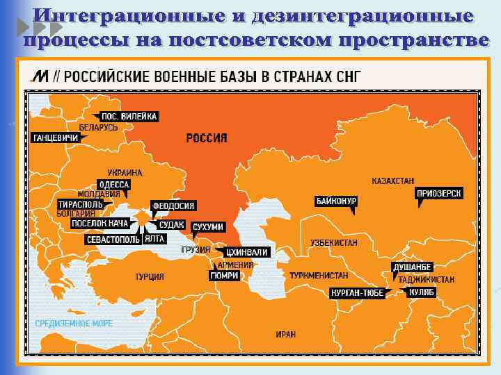 Содружество независимых Государств (СНГ) – межгосударственное объединение бывших союзных республик СССР 8. 12. 1991 г. – соглашение о создании Содружества Независимых Государств (БССР, РСФСР, УССР) 21. 12. 1991 г. – присоединились Азербайджан, Армения, Казахстан, Киргизия, Молдавия, Туркменистан, Таджикистан, Узбекистан 01. 1993 г. – принят Устав СНГ 3. 12. 1993 г. действительным членом СНГ стала Грузия 08. 2005 г. –Туркмения вышла из действительных членов СНГ и получила статус ассоциированного члена-наблюдателя 2008 г. – о желании вступить в СНГ заявил Афганистан 12. 08. – Грузия заявила о желании выхода из состава СНГ 18. 09. – Грузия официально вышла из состава СНГ