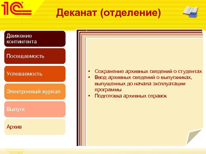 Подсистемы конфигурации • Справочники • Приемная комиссия • Деканат (отделение) • Учебная часть • Воспитатель ная работа • Производств енное обучение • Кадровый учет • Методическ ая работа • Расчеты со студентами • Управление качеством • Общежитие • Канцелярия • Профессиональное обучение • Сервис и администри рование Электронный журнал Информационный киоск Рассылка смссообщений Интеграция с Системами Контроля Управления Доступом Медицинский кабинет