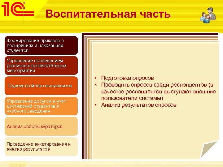 Воспитательная часть Формирование приказов о поощрениях и наказаниях студентов Управление проведением различных воспитательных мероприятий Трудоустройство выпускников Управление досугом и учет достижений студентов и учебного заведения Анализ работы кураторов Проведение анкетирования и анализ результатов • Подготовка и регистрация приказов: • Индивидуально • • Планирование мероприятий, назначение Организация опросов потенциальных • Планирование и проведение родительских Списком • ответственных выпускников (студентов последних курсов) • • Возможность начисления баллов в рейтинг Справочник «Спортивно-культурных собраний Регистрация прогнозных данных • • студентов, учебных групп Учет результатов проведенных объединений» (кружки, секции и проч. ) • мероприятий Подготовка характеристик студентов • Учет в кадровой истории студента Регистрация фактических данных по • • • Планирование работы спортивно-культурных • Учет общественных поручений студентов Подготовка опросов трудоустройству выпускников План-фактный анализ проведения • • Анализ наказаний и поощрений • • объединений с помощью документа «План Списки групп, списки отчисленных Проводить опросов среди респондентов (в • Аналитический учет наказаний в разрезе Анализ прогноза, фактического • • мероприятий работы» Дополнительная информация о студенте качестве респондентов выступают внешние трудоустройства и план-фактный анализ причин • • • Поощрение участников мероприятий в Хранение и анализ сведений об увлечениях Дни рождения пользователи системы) • Работа с резюме студентов виде начисления бонусных баллов в Представления на стипендию и Анализ результатов опросов • • • студентов Работа с социальными партнерами: • рейтинг Хранение и анализ сведений о достижениях материальную помощь • Заявки на трудоустройство студентов и учебного заведения Анализ успеваемости (текущая и итоговая) • • Формирование рейтингов групп и • Выборки резюме *Соответствует приказу МОН РФ от 15 марта 2013 • студентов Назначение и учет кураторов • Анализ вакансий г. N 185 "Об утверждении Порядка применения к обучающимся и снятия с обучающихся мер дисциплинарного взыскания"
