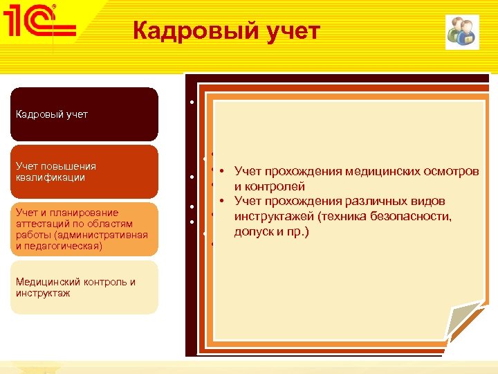 Кадровый учет Учет повышения квалификации Учет и планирование аттестаций по областям работы (административная и педагогическая) Медицинский контроль и инструктаж • Учет сотрудников и анализ кадрового обеспечения в разрезе организаций, места работы (штат, совместительство), подразделений, должностей, ученых званий и • Учет прохождения по Учет результатов аттестации • степеней • • Планирование прохождения • Учет прохождения медицинских осмотров Сотрудникам • Формирование приказов на прием, • По областям (педагогическая и • и контролей Методическим комиссиям перемещение и увольнение • административная) • Учет прохождения различных видов Видам • Наличие справки об отсутствии судимости • По видам (на соответствие должности и • инструктажей (техника безопасности, Курсам • Интеграция с программными продуктами категории) допуск и пр. ) • « 1 С: Зарплата и управление персоналом» , Анализ • Учет рекомендаций « 1 С: Зарплата и кадры бюджетного учреждения» и « 1 С: Зарплата и кадры образовательного учреждения 8»