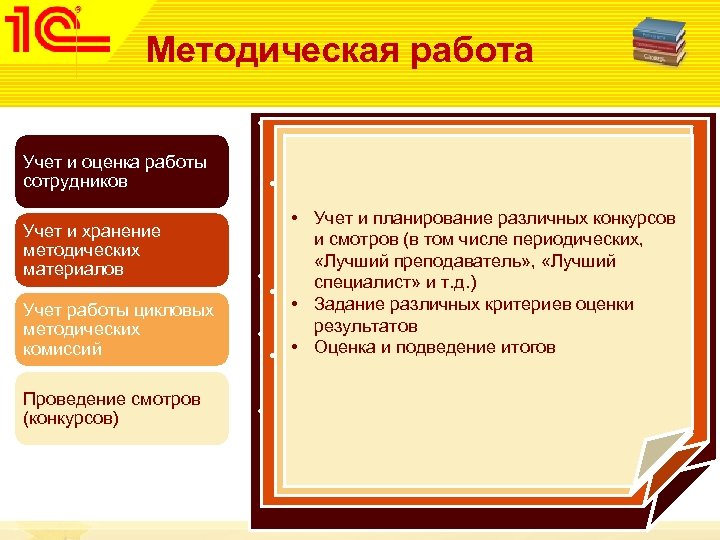 Методическая работа • Учет и оценка работы сотрудников Учет и хранение методических материалов Учет работы цикловых методических комиссий Проведение смотров (конкурсов) Учет и анализ по областям работы, типам работы (организационная, учебно-методическая, научноисследовательская и т. д. ), видам работы (выступления, • публикация статьи, разработка рабочей программы, • Учет методических материалов в разрезе Ведение списка ЦМК (ПЦК); проведение открытого урока и пр. ), уровням работы • видов, авторов, дисциплин, принадлежности, Учет дисциплин закрепленных за ЦМК; • Учет и планирование различных конкурсов (внутриколледжевский, городской, республиканский, • даты разработки, актуальности, применимости Подготовка приказов о составе ЦМК и учет российский, международный), учебным периодам и и смотров (в том числе периодических, для различных специальностей и в различных текущего состава ЦМК; цикловым методическим комиссиям «Лучший преподаватель» , «Лучший • рабочих учебных планах Назначение и учет заведующих ЦМК; • Планирование и согласование работ в разрезе областей специалист» и т. д. ) • работы, сотрудников, цикловых методических комиссий, • Хранение электронных методических Анализ списка дисциплин утвержденных • Задание различных критериев оценки материалов непосредственно в базе данных рабочих учебных планов, не закрепленных учебных периодов, типов, видов и уровней работы результатов • Оценка работ и построение рейтингов сотрудников и программы ни за одной ЦМК. • Оценка и подведение итогов • цикловых методических комиссий в разрезе областей • Анализ состава имеющихся методических Подготовка, учет и печать протоколов работы, учебных периодов, типов, видов и уровней материалов, их актуальности и применимости заседаний ЦМК работы • План-фактный анализ и динамика работы сотрудников и цикловых методических комиссий, история работы сотрудников