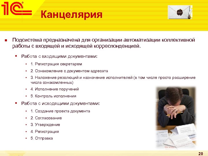 Канцелярия n Подсистема предназначена для организации автоматизации коллективной работы с входящей и исходящей корреспонденцией. § Работа с входящими документами: § 1. Регистрация секретарем § 2. Ознакомление с документом адресата § 3. Наложение резолюций и назначение исполнителей (в том числе просто расширение числа ознакомленных) § 4. Исполнение поручений § 5. Контроль исполнения § Работа с исходящими документами: § 1. Создание проекта документа § 2. Согласование § 3. Утверждение § 4. Регистрация § 5. Отправка 20