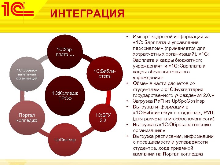 ИНТЕГРАЦИЯ • 1 С: Зарплата … 1 С: Образовательная организация 1 С: Библиотека • 1 С: Колледж ПРОФ • • 1 С: БГУ 2. 0 Портал колледжа Up. Gos. Insp • • Импорт кадровой информации из « 1 С: Зарплата и управление персоналом» (применяется для хозрасчетных организаций), « 1 С: Зарплата и кадры бюджетного учреждения» и « 1 С: Зарплата и кадры образовательного учреждения» Обмен в части расчетов со студентами с « 1 С: Бухгалтерия государственного учреждения 2. 0. » Загрузка РУП из Up. Spo. Gos. Insp Выгрузка информации в « 1 С: Библиотеку» о студентах, РУП (для расчета книгообеспеченности) Выгрузка в « 1 С: Образовательную организацию» Выгрузка расписания, информации о посещаемости и успеваемости студентов, ходе приемной кампании на Портал колледжа