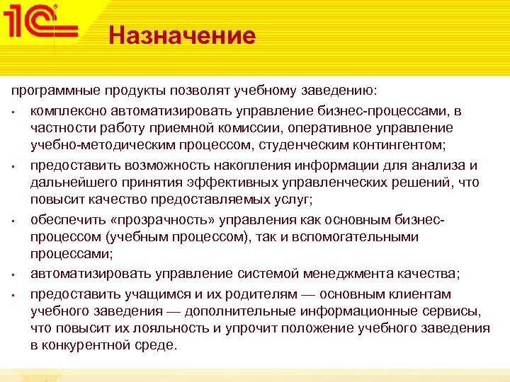 Назначение программные продукты позволят учебному заведению: • комплексно автоматизировать управление бизнес-процессами, в частности работу приемной комиссии, оперативное управление учебно-методическим процессом, студенческим контингентом; • предоставить возможность накопления информации для анализа и дальнейшего принятия эффективных управленческих решений, что повысит качество предоставляемых услуг; • обеспечить «прозрачность» управления как основным бизнеспроцессом (учебным процессом), так и вспомогательными процессами; • автоматизировать управление системой менеджмента качества; • предоставить учащимся и их родителям — основным клиентам учебного заведения — дополнительные информационные сервисы, что повысит их лояльность и упрочит положение учебного заведения в конкурентной среде.