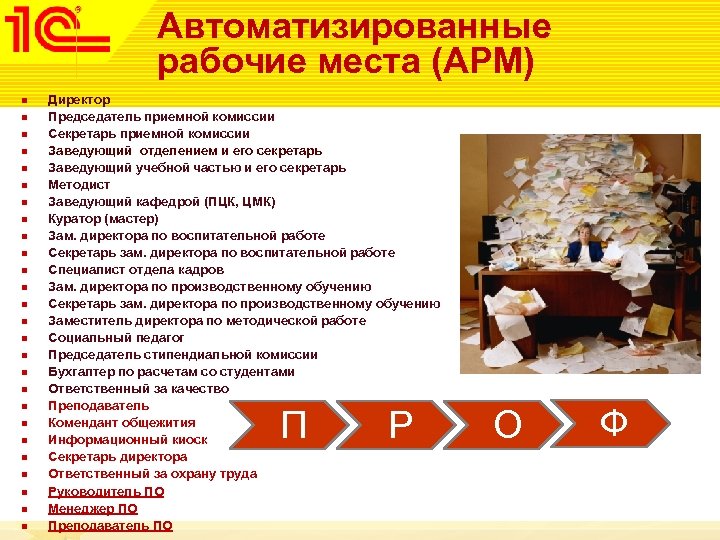 Автоматизированные рабочие места (АРМ) n n n n n n n Директор Председатель приемной комиссии Секретарь приемной комиссии Заведующий отделением и его секретарь Заведующий учебной частью и его секретарь Методист Заведующий кафедрой (ПЦК, ЦМК) Куратор (мастер) Зам. директора по воспитательной работе Секретарь зам. директора по воспитательной работе Специалист отдела кадров Зам. директора по производственному обучению Секретарь зам. директора по производственному обучению Заместитель директора по методической работе Социальный педагог Председатель стипендиальной комиссии Бухгалтер по расчетам со студентами Ответственный за качество Преподаватель Комендант общежития Информационный киоск Секретарь директора Ответственный за охрану труда Руководитель ПО Менеджер ПО Преподаватель ПО П Р О Ф