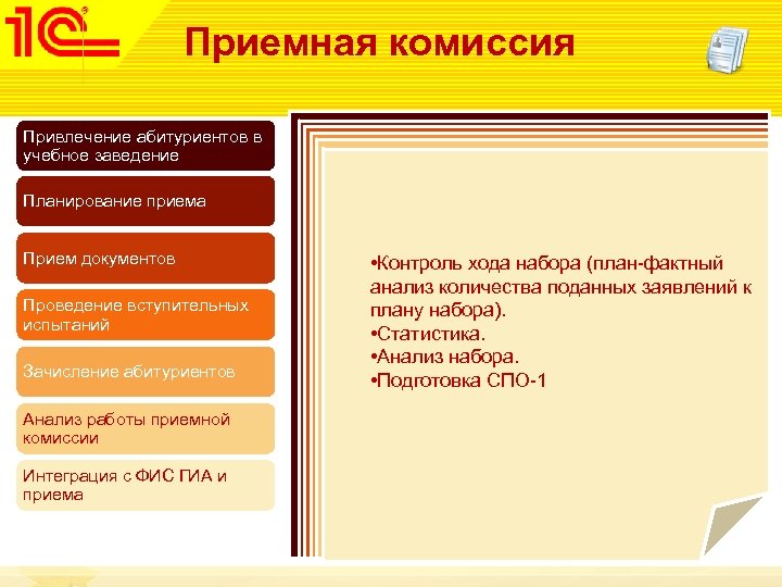 Приемная комиссия Привлечение абитуриентов в учебное заведение Планирование приема Прием документов Проведение вступительных испытаний Зачисление абитуриентов Анализ работы приемной комиссии Интеграция с ФИС ГИА и приема • Планирование маркетинговых мероприятий. • Регистрация затрат на маркетинговые • Формирование личного дела абитуриента • • Ручной ввод сотрудником приемной комиссии. План набора (контрольные цифры приема) Подготовка необходимых документов мероприятия • Самостоятельный ввод абитуриентом с помощью • Планирование потоков, вступительных Экзаменационные листы. • Регистрация касаний (количества специального мастера (в том числе через интернет) Экзаменационная ведомость. групп с учетом оплаты обучения, проинформированных об услугах учебного • Построение вступительных рейтингов. • Контроль сдачи необходимых документов Фиксация результатов вступительных имеющегося образования, специальностей заведения потенциальных клиентов) в • • Контроль хода набора (план-фактный Формирование приказов о зачислении (произвольный набор). испытаний на которые поданы заявления и разрезе каналов и источников абитуриентов в сформированные группы Экзаменационные оценки. • Выдача абитуриенту необходимого набора анализ количества поданных заявлений к прохождения подготовительных курсов. информирования Результаты собеседований. • С помощью рейтинга. документов: плану набора). • Планирование расписания вступительных • Регистрация интересов (количества Печать результатов испытаний. • Вручную. • Расписка. • Статистика. испытаний. • Контракт. заинтересовавшихся услугами учебного Выдача справки о результатах • • Анализ набора. Мастер формирования рейтингов • • Экзаменационный лист. Размещение расписания на сайте учебного заведения) в разрезе каналов и источников прохождения вступительных испытаний. • • Подготовка СПО-1 Контроль копий аттестатов об • Учет данных абитуриентов. заведения. информирования Экспорт результатов на сайт учебного образовании • Контроль возврата документов. • Планирование собеседований. • Анализ эффективности приемной кампании и заведения. • Подача заявлений на несколько конкурсов выбранных каналов и источников Анализ оценок вступительных испытаний информирования