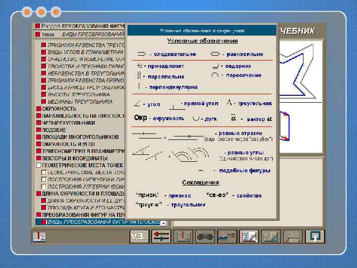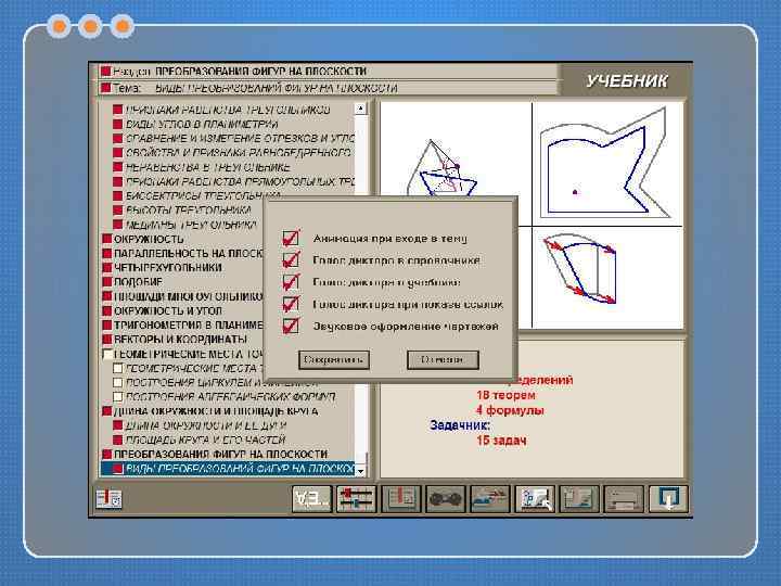 Структура ЭУ В «Учебнике» очень четко представлены доказательства теорем; они выполнены пошагово с помощью управляющих кнопок. Причем все дополнительные построения мгновенно отображаются на чертеже, сопровождаясь звуковым сигналом (при желании его можно выключить). Сами чертежи красочные, аккуратные, со всеми надлежащими обозначениями.