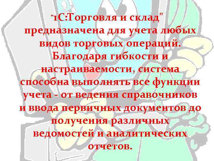"1 С: Торговля и склад" предназначена для учета любых видов торговых операций. Благодаря гибкости и настраиваемости, система способна выполнять все функции учета - от ведения справочников и ввода первичных документов до получения различных ведомостей и аналитических отчетов.