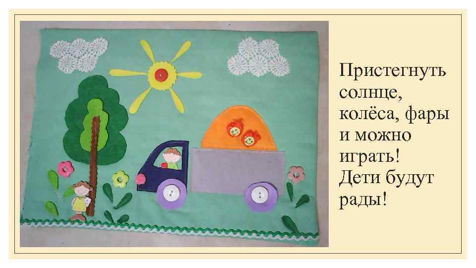 Мастер-класс для родителей ◦ По изготовлению своими руками настольного коврика - развивалочки для своего ребёнка (тема «Транспорт» ) ◦ На коврике используются: 1. Пуговицы (солнце, колёса машины) 2. Кнопка (фара) 3. Использование материалов с различной структурой для сенсорного восприятия 4. Использование однотонных материалов для изучения и повторения основных цветов