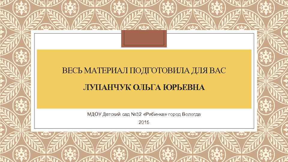 ВЕСЬ МАТЕРИАЛ ПОДГОТОВИЛА ДЛЯ ВАС ЛУПАНЧУК ОЛЬГА ЮРЬЕВНА МДОУ Детский сад № 32 «Рябинка» город Вологда 2015