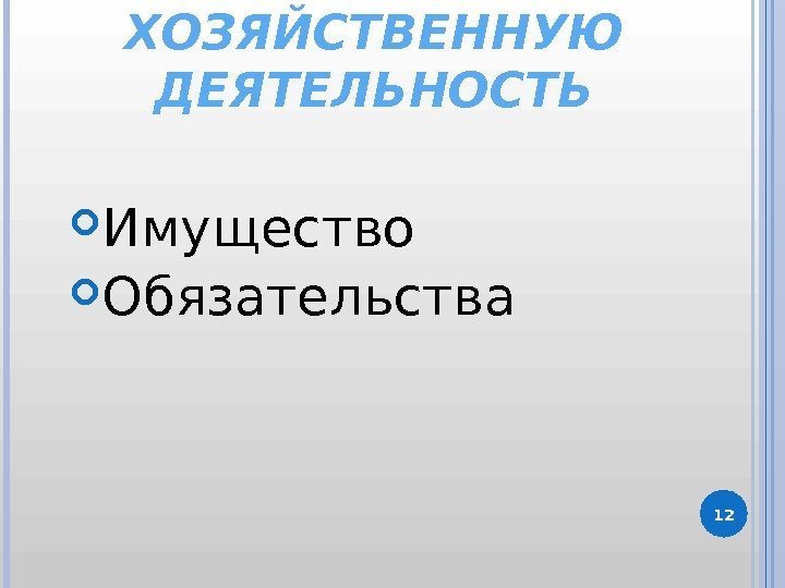 12 ОБЪЕКТЫ, ОБЕСПЕЧИВАЮЩИЕ ХОЗЯЙСТВЕННУЮ ДЕЯТЕЛЬНОСТЬ Имущество Обязательства