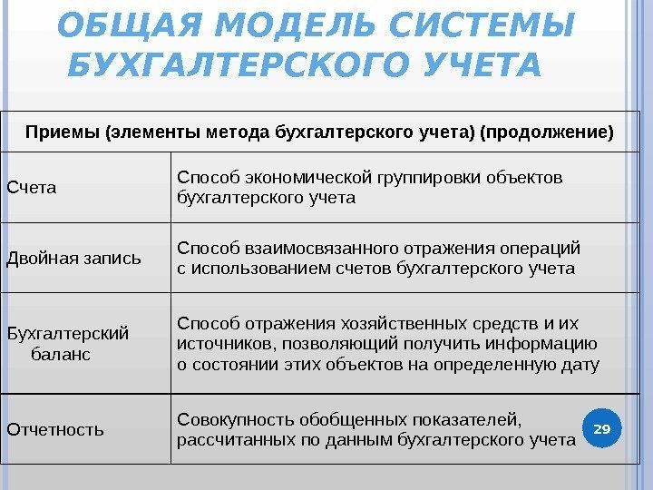 28 ОБЩАЯ МОДЕЛЬ СИСТЕМЫ БУХГАЛТЕРСКОГО УЧЕТА СИСТЕМА БУХГАЛТЕРСКОГО УЧЕТА Этапы учетного процесса НАБЛЮДЕНИЕ ИЗМЕРЕНИЕ РЕГИСТРАЦИЯ ОБОБЩЕНИЕ Приемы (элементы метода бухгалтерского учета) Документация Способ юридического оформления хозяйственных операций, письменное свидетельство о совершении хозяйственной операции Инвентаризация Способ проверки соответствия фактического наличия хозяйственных средств данным бухгалтерского учета Оценка Способ, с помощью которого хозяйственные средства получают денежное выражение Калькуляция Способ исчисления затрат на изготовление единицы изделия