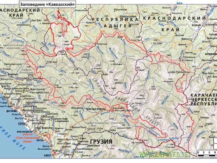 1 – Сочинский национальный парк 2 – Кавказский заповедник (КГПБЗ) 3 – Тебердинский заповедник (ТГПБЗ) 4 – Национальный парк «Приэльбрусье» 5 – Кабардино-Балкарский заповедник 6 – Национальный парк «Алания» 7 – Северо-Осетинский заповедник 8 – Заповедник Эрзи 9 – Дагестанский заповедник