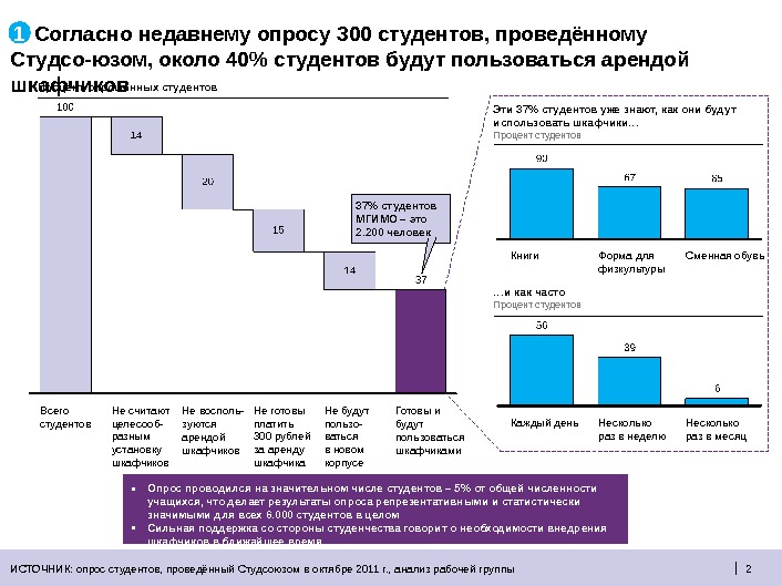 | 2 1. Согласно недавнему опросу 300 студентов, проведённому Студсо-юзом, около 4 0% студентов будут пользоваться арендой шкафчиков 1 ИСТОЧНИК: опрос студентов, проведённый Студсоюзом в октябре 2011 г. , анализ рабочей группы Готовы и будут пользоваться шкафчиками. Не будут пользо- ваться в новом корпусе. Не готовы платить 300 рублей за аренду шкафчика. Не восполь- зуются арендой шкафчиков. Не считают целесооб- разным установку шкафчиков. Всего студентов Эти 37% студентов уже знают, как они будут использовать шкафчики… Процент студентов. Процент опрошенных студентов … и как часто Процент студентов Сменная обувь. Форма для физкультуры. Книги 37 % студентов МГИМО – это 2. 20 0 человек ▪ Опрос проводился на значительном числе студентов – 5% от общей численности учащихся, что делает результаты опроса репрезентативными и статистически значимыми для всех 6. 000 студентов в целом ▪ Сильная поддержка со стороны студенчества говорит о необходимости внедрения шкафчиков в ближайшее время Несколько раз в месяц. Несколько раз в неделю. Каждый день
