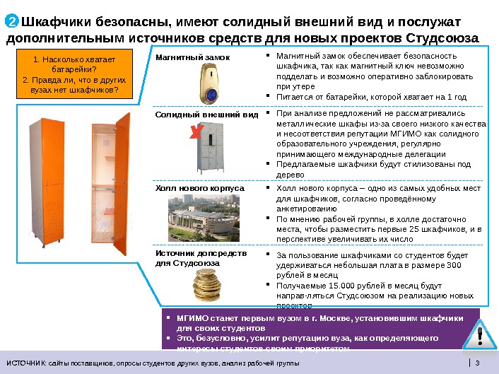 | 3 Магнитный замок обеспечивает безопасность шкафчика, так как магнитный ключ невозможно подделать и возможно оперативно заблокировать при утере Питается от батарейки, которой хватает на 1 год При анализе предложений не рассматривались металлические шкафы из-за своего низкого качества и несоответствия репутации МГИМО как солидного образовательного учреждения, регулярно принимающего международные делегации Предлагаемые шкафчики будут стилизованы под дерево Холл нового корпуса – одно из самых удобных мест для шкафчиков, согласно проведённому анкетированию По мнению рабочей группы, в холле достаточно места, чтобы разместить первые 25 шкафчиков, и в перспективе увеличивать их число За пользование шкафчиками со студентов будет удерживаться небольшая плата в размере 300 рублей в месяц Получаемые 15. 000 рублей в месяц будут направ-ляться Студсоюзом на реализацию новых проектов ▪ МГИМО станет первым вузом в г. Москве, установившим шкафчики для своих студентов ▪ Это, безусловно, усилит репутацию вуза, как определяющего интересы студентов своим приоритетом 2. Шкафчики безопасны, имеют солидный внешний вид и послужат дополнительным источников средств для новых проектов Студсоюза ИСТОЧНИК: сайты поставщиков, опросы студентов других вузов, анализ рабочей группы2 1. Насколько хватает батарейки? 2. Правда ли, что в других вузах нет шкафчиков? Магнитный замок Солидный внешний вид Холл нового корпуса Источник допсредств для Студсоюза